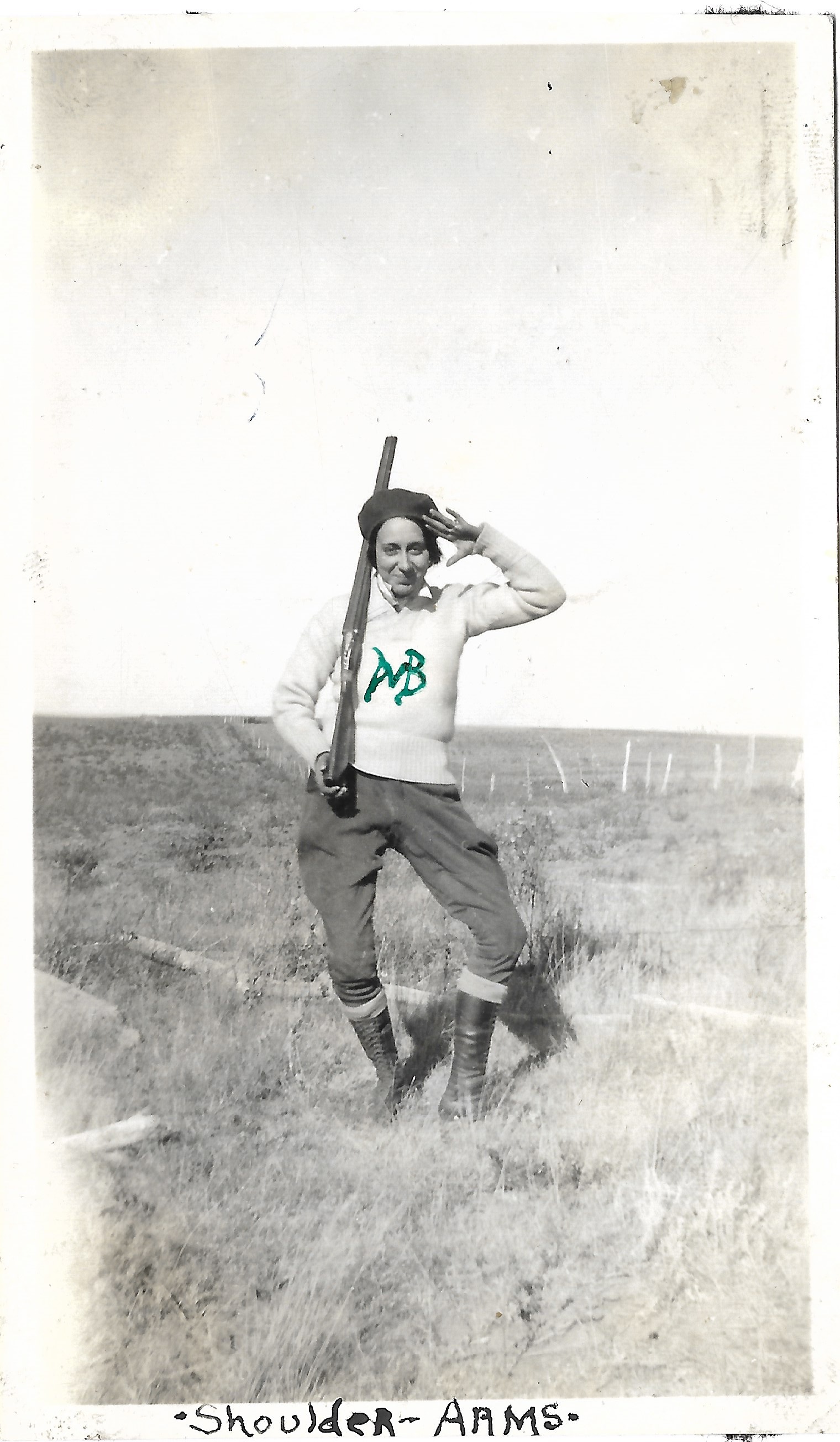 A photograph of Dorris Bullard in a field in Colorado. The image is captioned "Shoulder Arms."