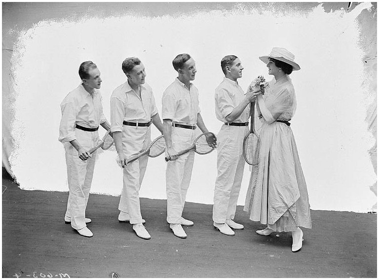 A photograph of Ross Hamilton as "Marjorie" with four others who are dressed in matching white outfits and holding tennis rackets while looking at Hamilton. Hamilton is holding the hands of the person closest in proximity to them. Hamilton is wearing a light-colored dress, heels, earrings, gloves, and a hat.