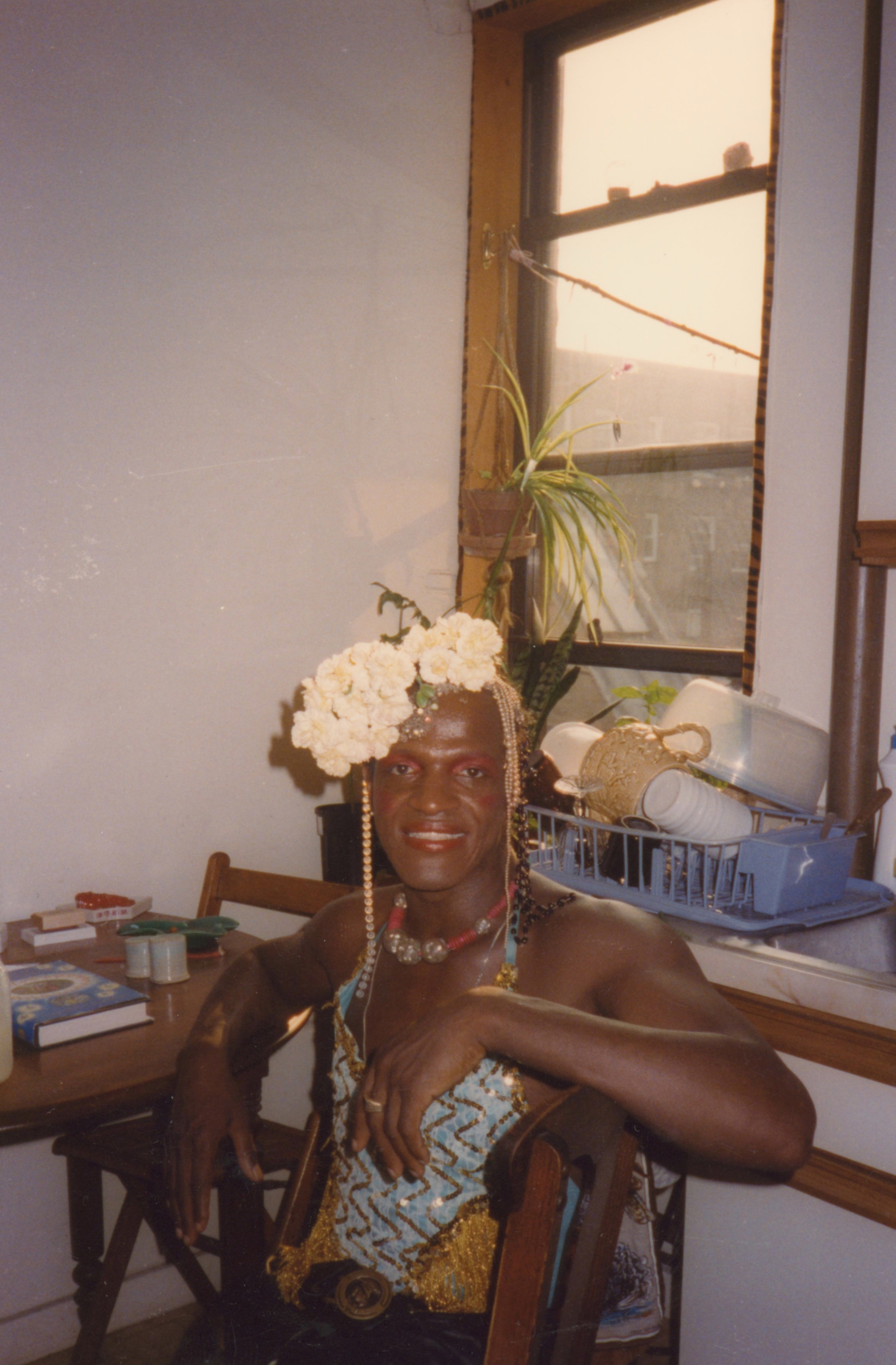 Photographs of Marsha P. Johnson wearing a white flora headpiece and a blue and gold sequined top. She's in Randy Wicker's apartment in Hoboken, New Jersey, dressed for Randy's wedding to his partner David Combs. Behind her there are dishes drying on the counter, a house plant, and a wooden kitchen table.