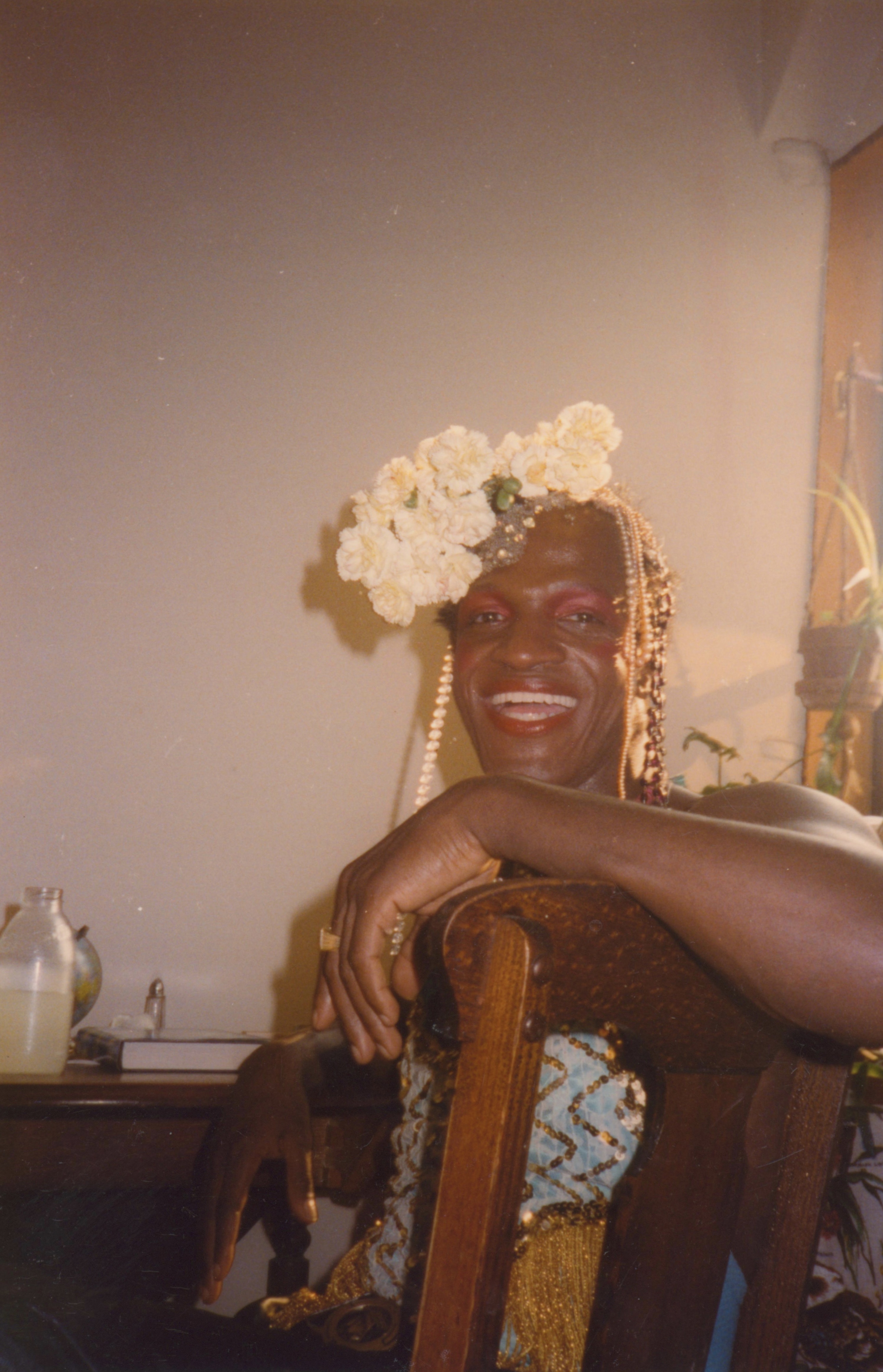 Photographs of Marsha P. Johnson Wearing a White Floral Headpiece and Blue and Gold Sequined Top, Sitting in Randy Wicker's Apartment