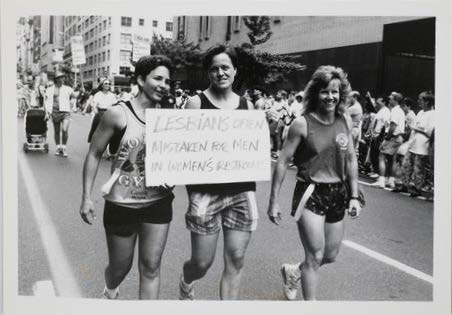 This is a photograph of a small group walking with a sign that says, "Lesbians Often Mistaken for Men in Women’s Restrooms."