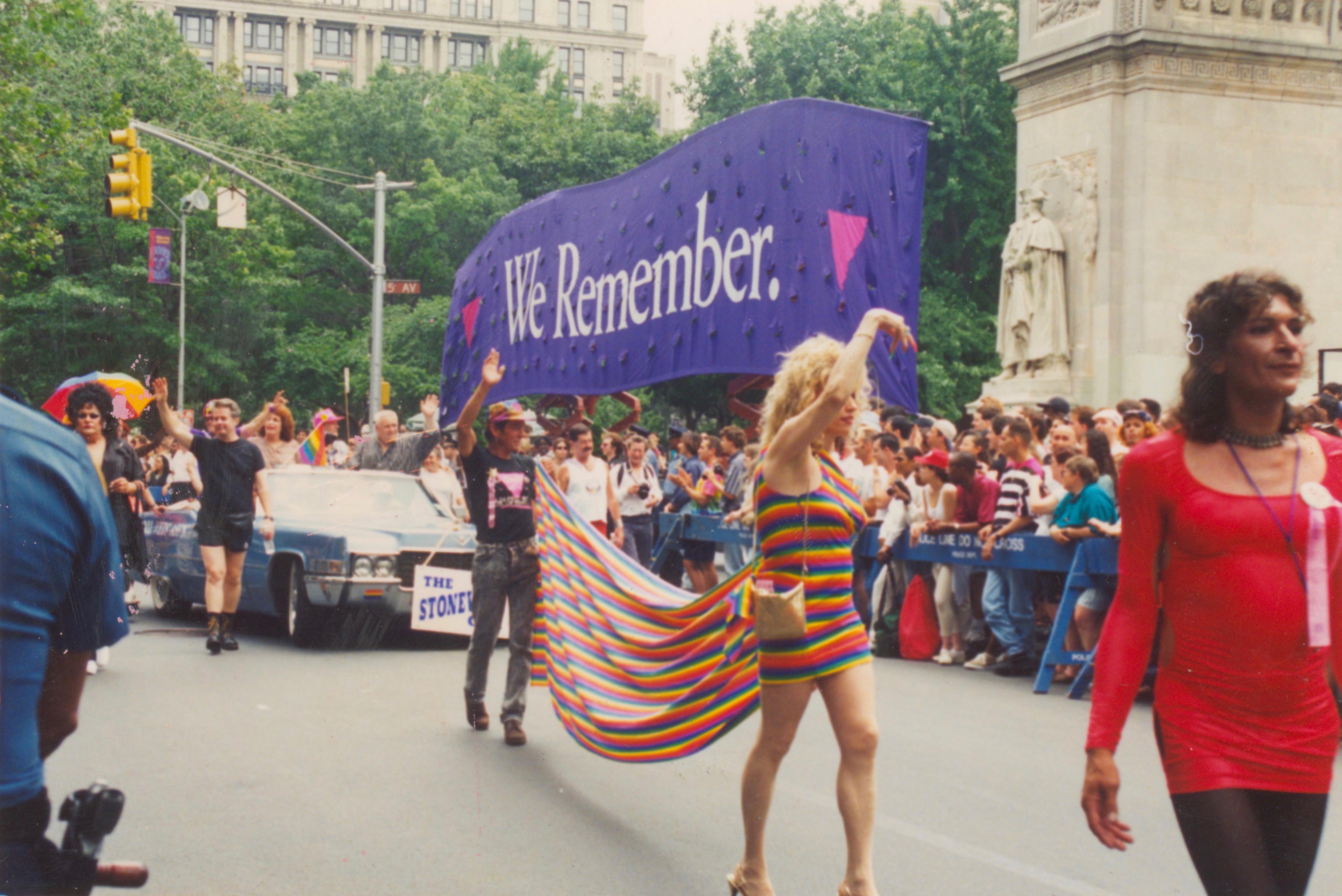 A photograph of Sylvia Rivera and Queen Alison at the New York City Pride Parade on June 25, 1995. Sylvia walks ahead of Queen Alison wearing a red dress and black tights. Queen Alison is behind her with blonde hair, wearing a rainbow striped dress with a long train. Behind them is a purple banner with two pink triangles which reads "We Remember."