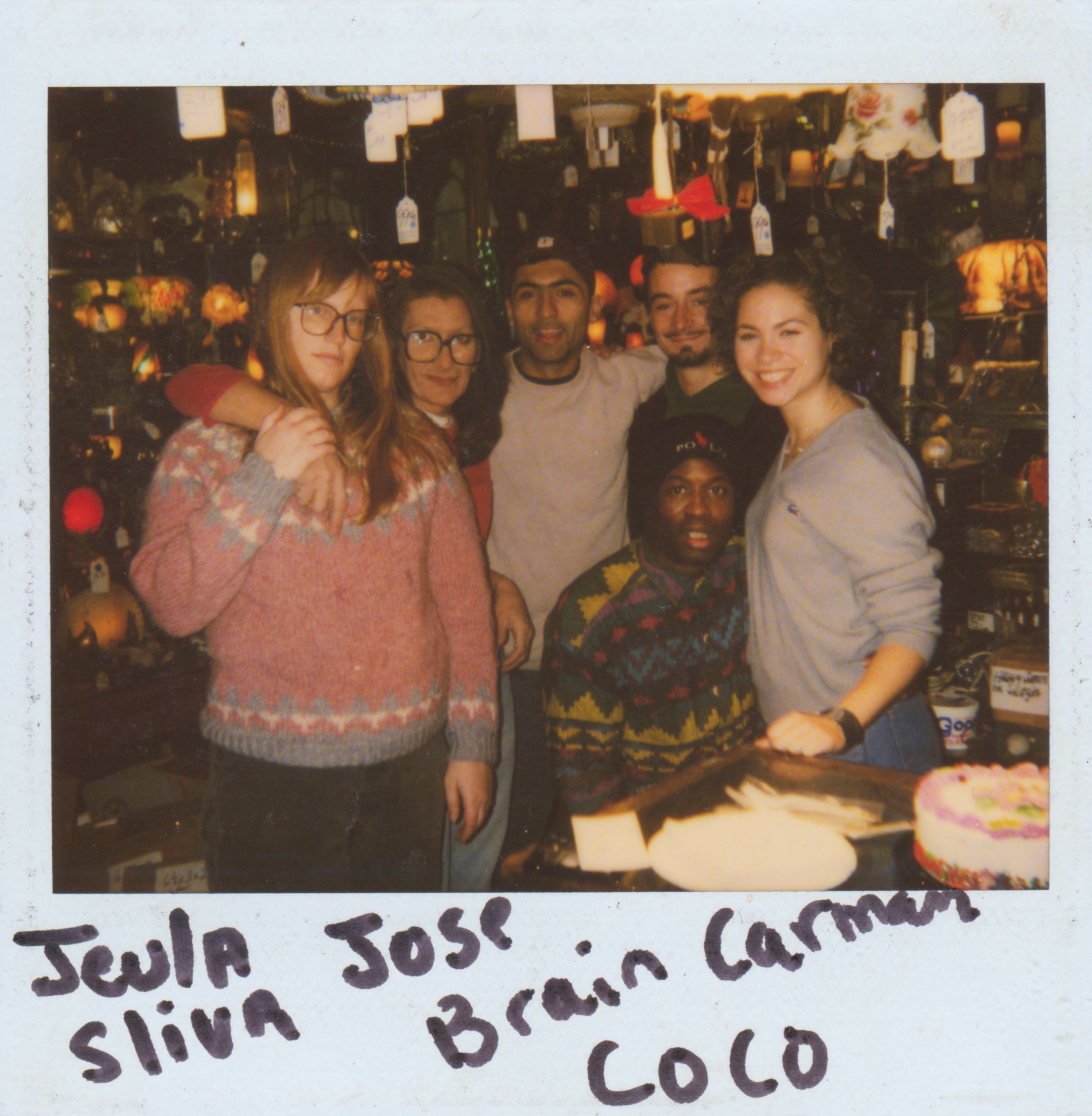 A Polaroid of Sylvia Rivera posing with a group including her partner Julia Murray and Cocoa Rodriguez at Randy Wicker's store Uplift Lighting. Sylvia's wearing glasses, a red sweater, and jeans, and has her hand around Julia's shoulder. Julia's wearing a pink and blue sweater and black pants. Cocoa's sitting and wearing a black hat and colorful patterned sweater. At the bottom of the Polaroid, it reads, "Jeula, Sliva, Jose, Brain, Carman, Coco."