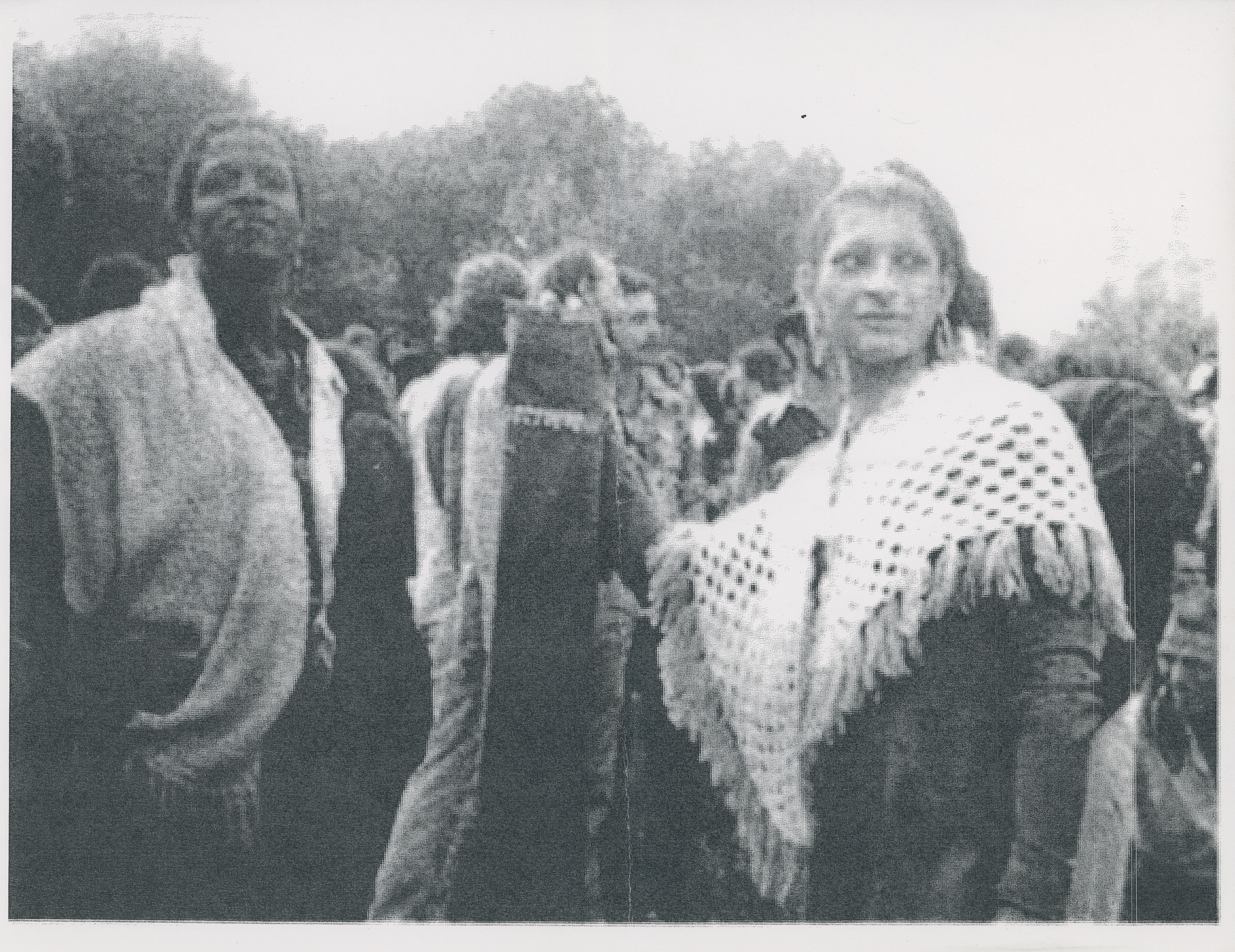 A black-and-white photograph of Marsha P. Johnson and Sylvia Rivera at an outdoor gathering. Marsha and Sylvia are dressed in warm clothing, standing in front of a crowd of others. Treetops are visible directly behind the crowd.