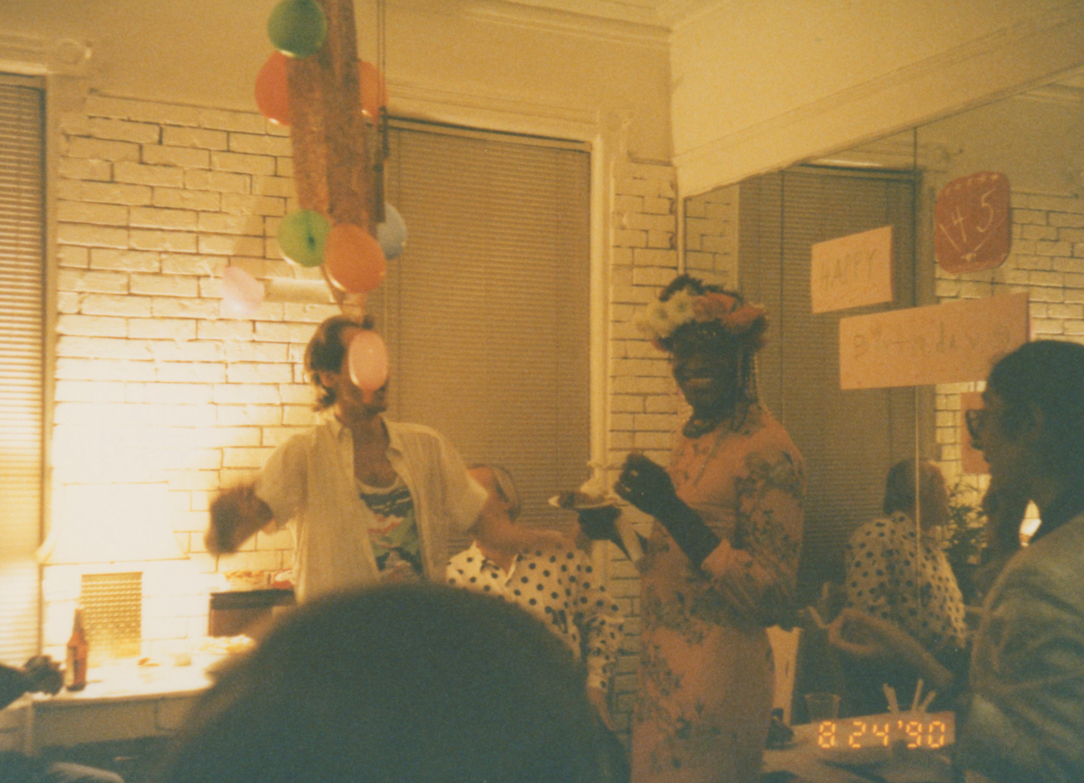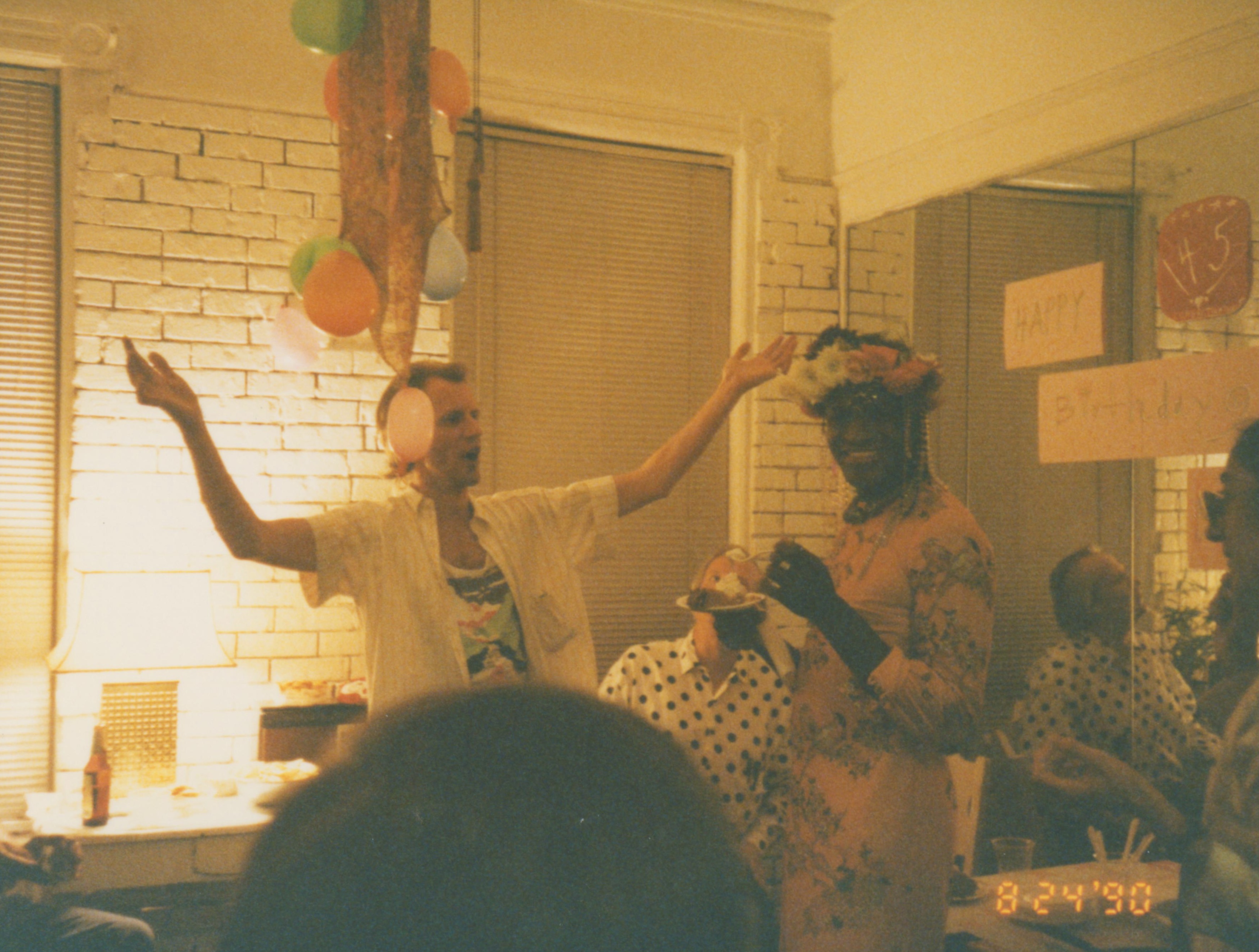 Photographs of Marsha P. Johnson eating cake at her birthday party. She’s wearing a pink floral dress and a floral headpiece. Randy Wicker’s partner George Flimlin stands next to her with his arms raised and wearing a white shirt and colorful patterned tank top. Balloons hang down from the ceiling.