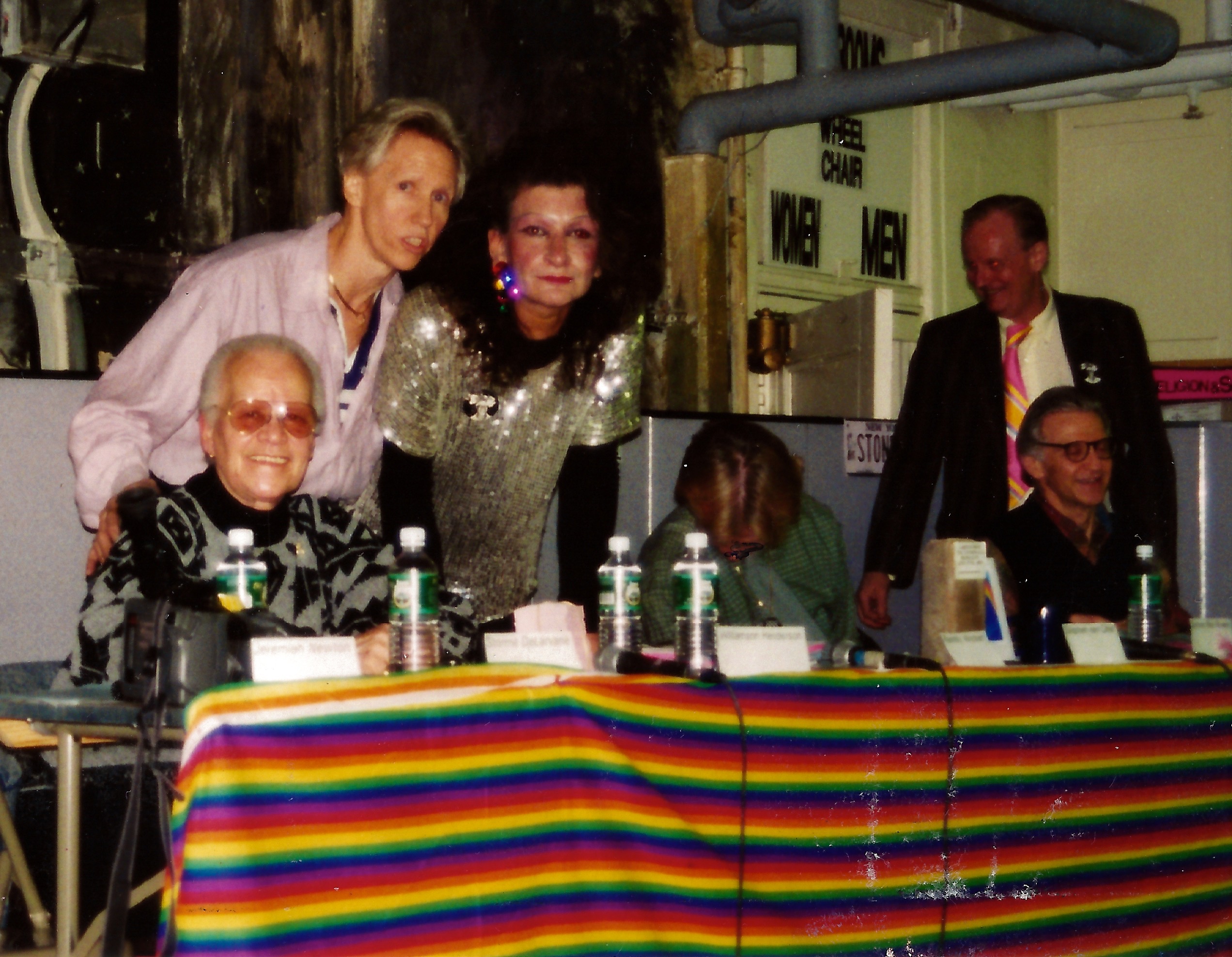 A Photograph of Stormé DeLarverie seated at the end of a long table covered in rainbow bunting. Two other panelists are seated while three stand behind the table.
