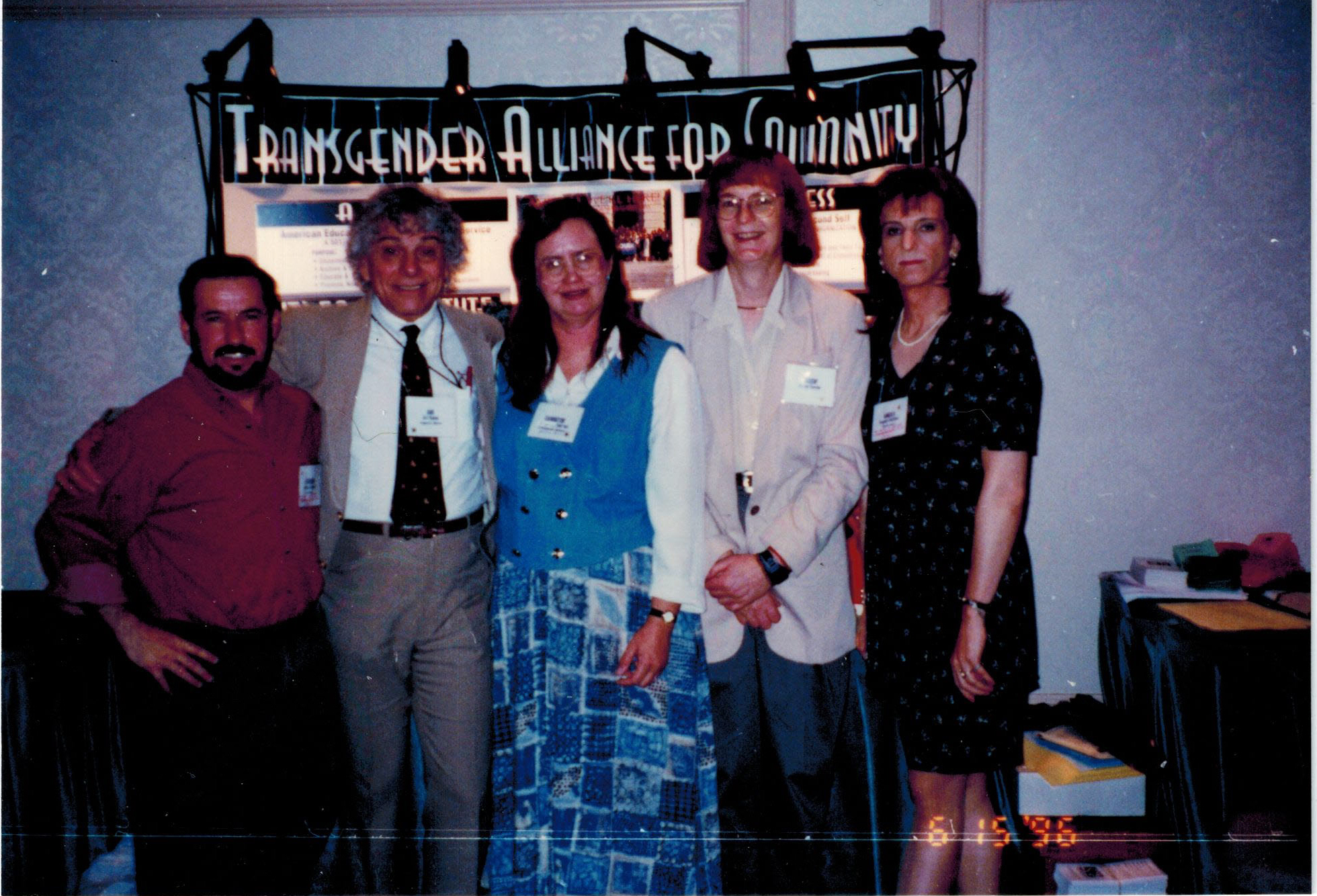 Jamison Green (left), Ariadne Green (center left), Mary Fairfax (center), Jessica Xavier (center right) and Angela Gardner (right) pose for a photograph in front of a Transgender Alliance for Community informational poster