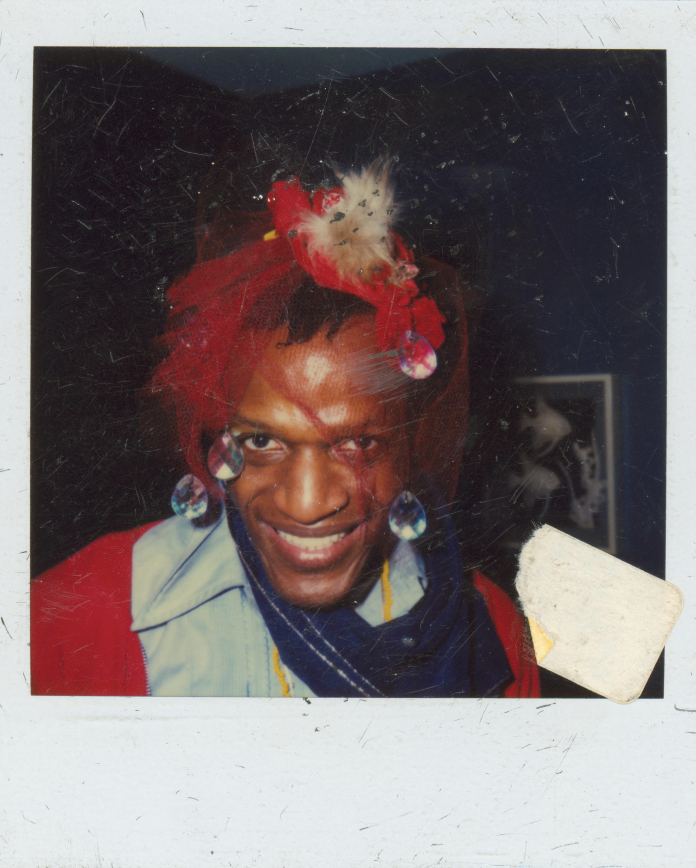A Polaroid of Marsha P. Johnson smiling at the camera wearing a red mesh headpiece with a fur embellishment, and large gems hanging on the ends. She's wearing a black scarf, blue shirt, and red cardigan.