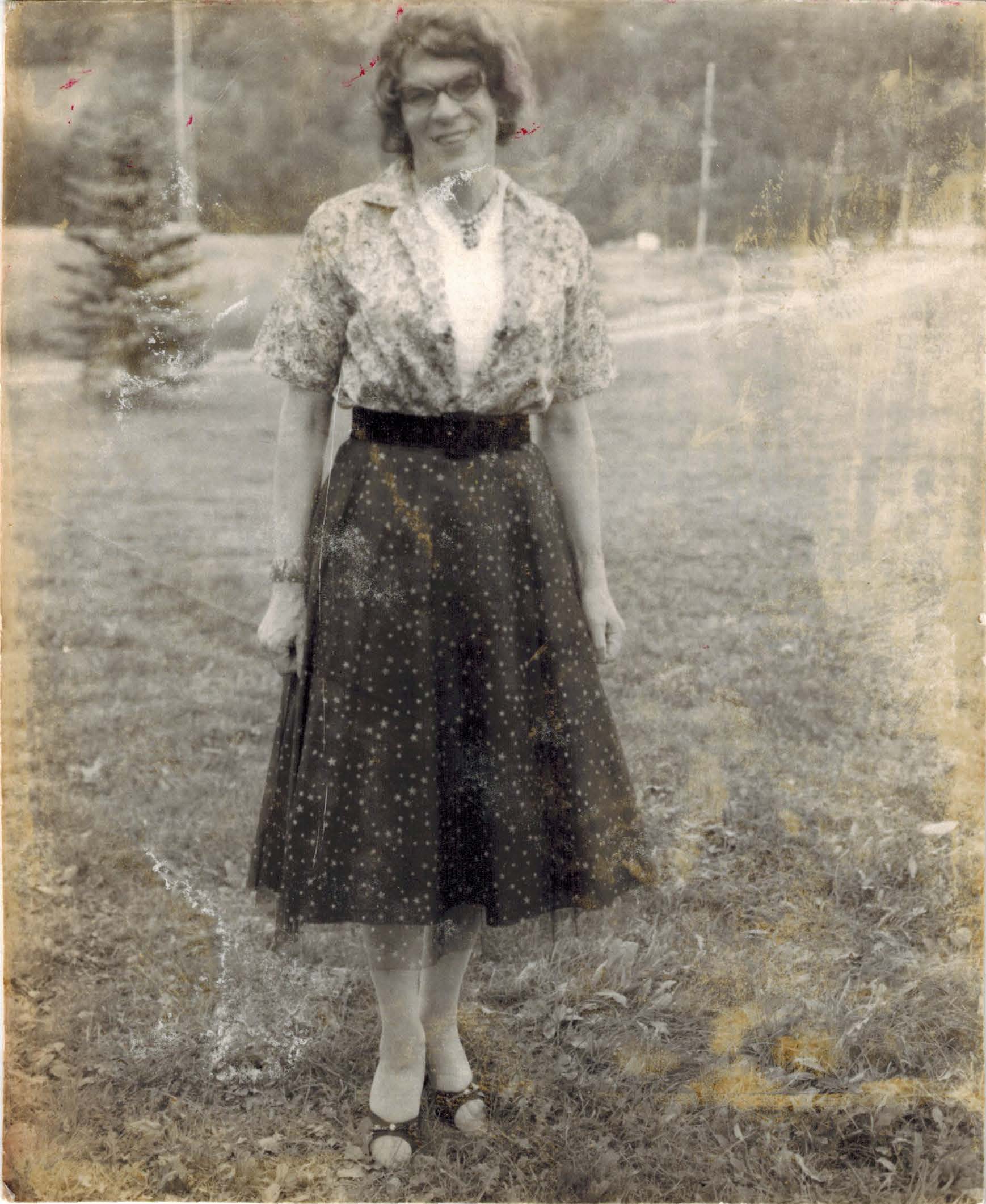 A black and white photograph of Felicity Chandelle in a belted, polk-a-dot skirt with a patterned blouse standing outside.