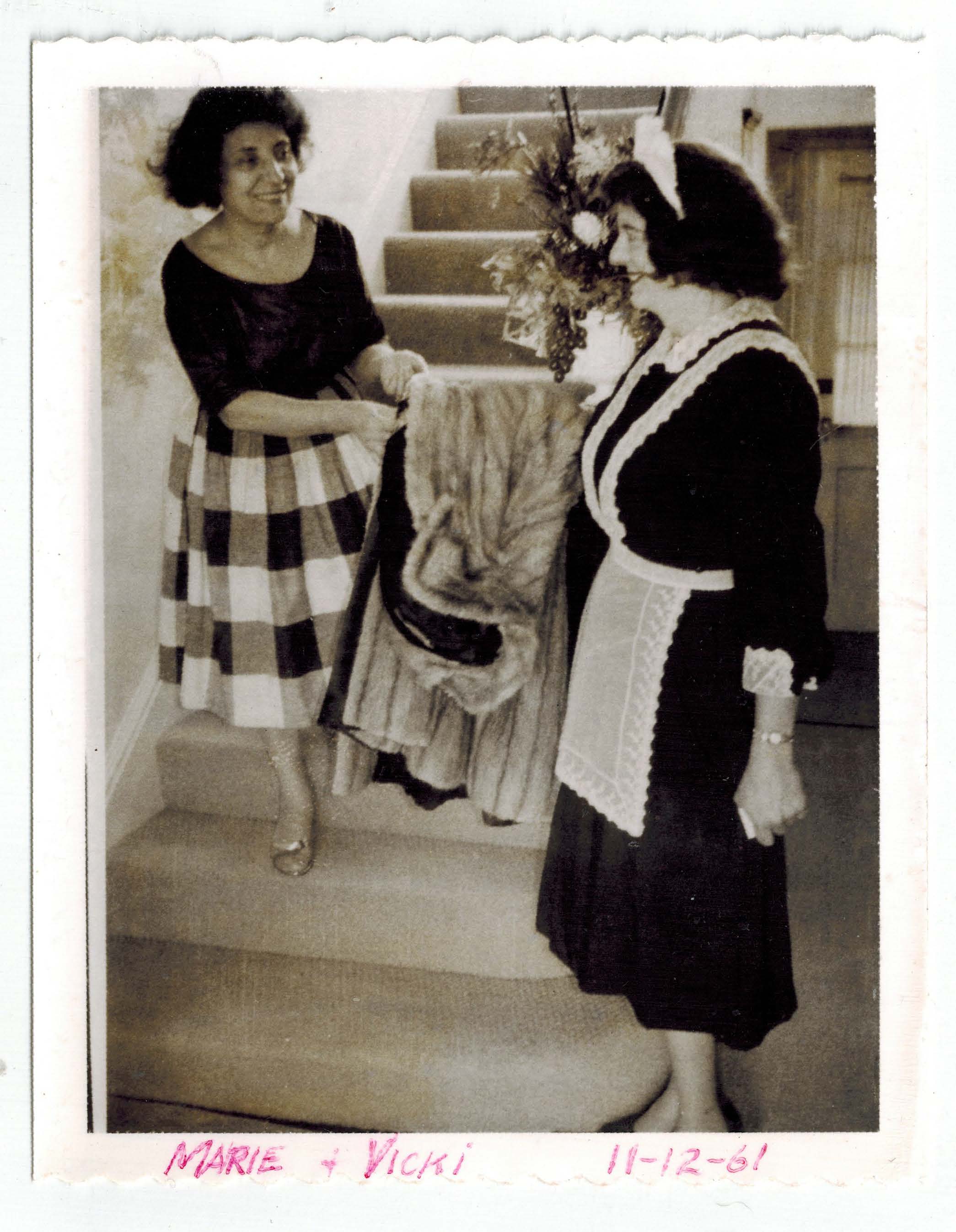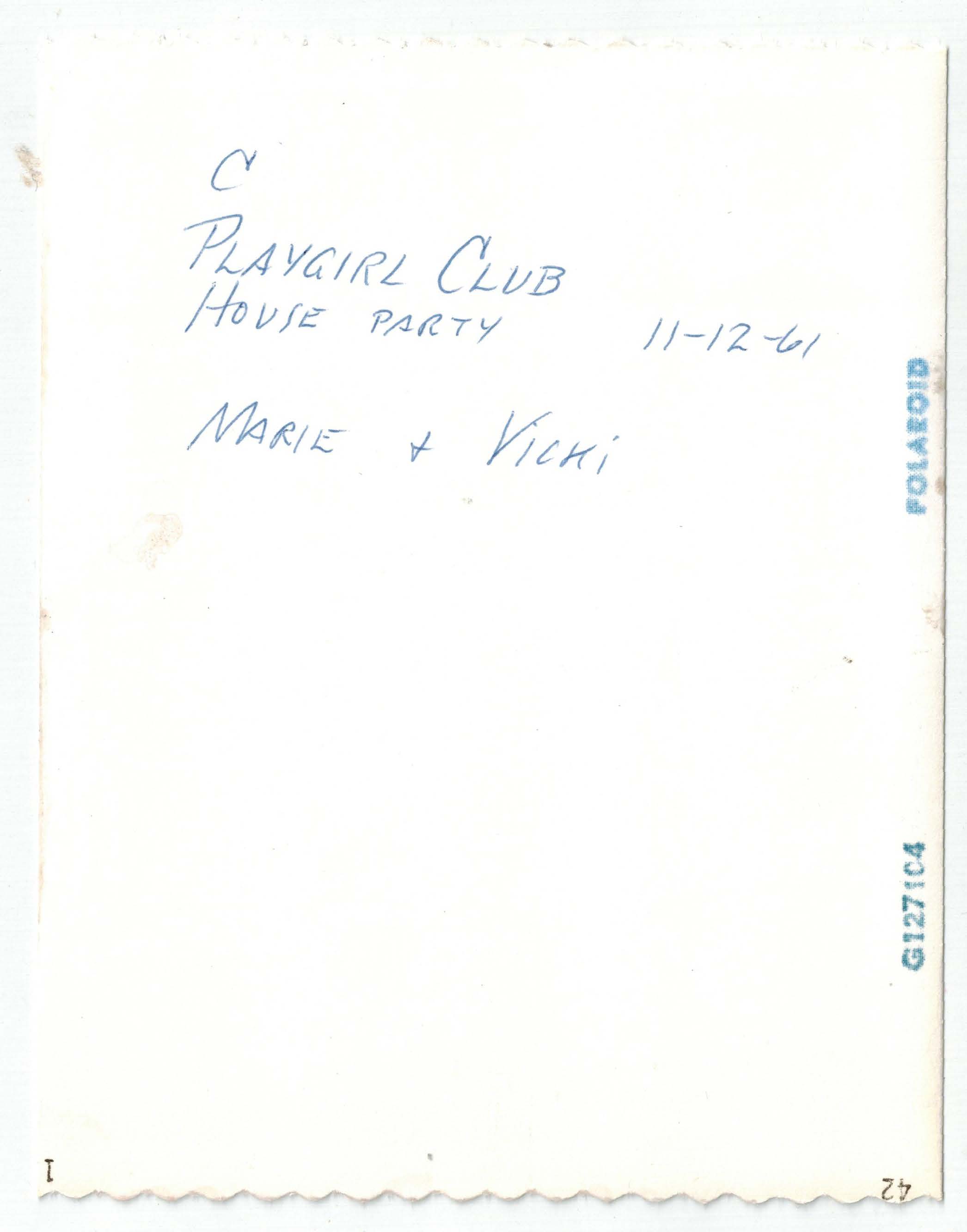 A photograph of Marie descending a set of stairs, smiling at Vicki, who is wearing a maid's outfit and smiling back at Marie. "Playgirl House Party" is written on the back.
