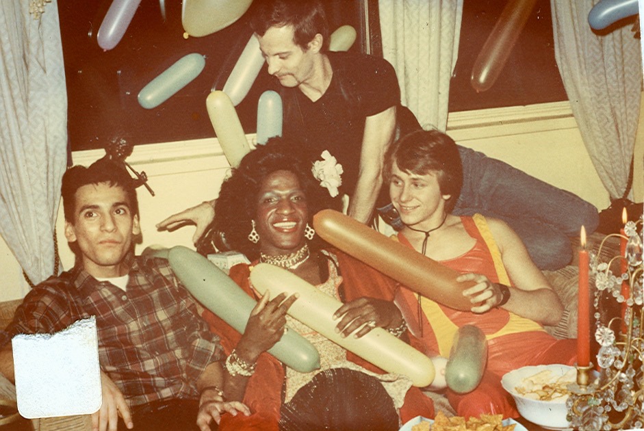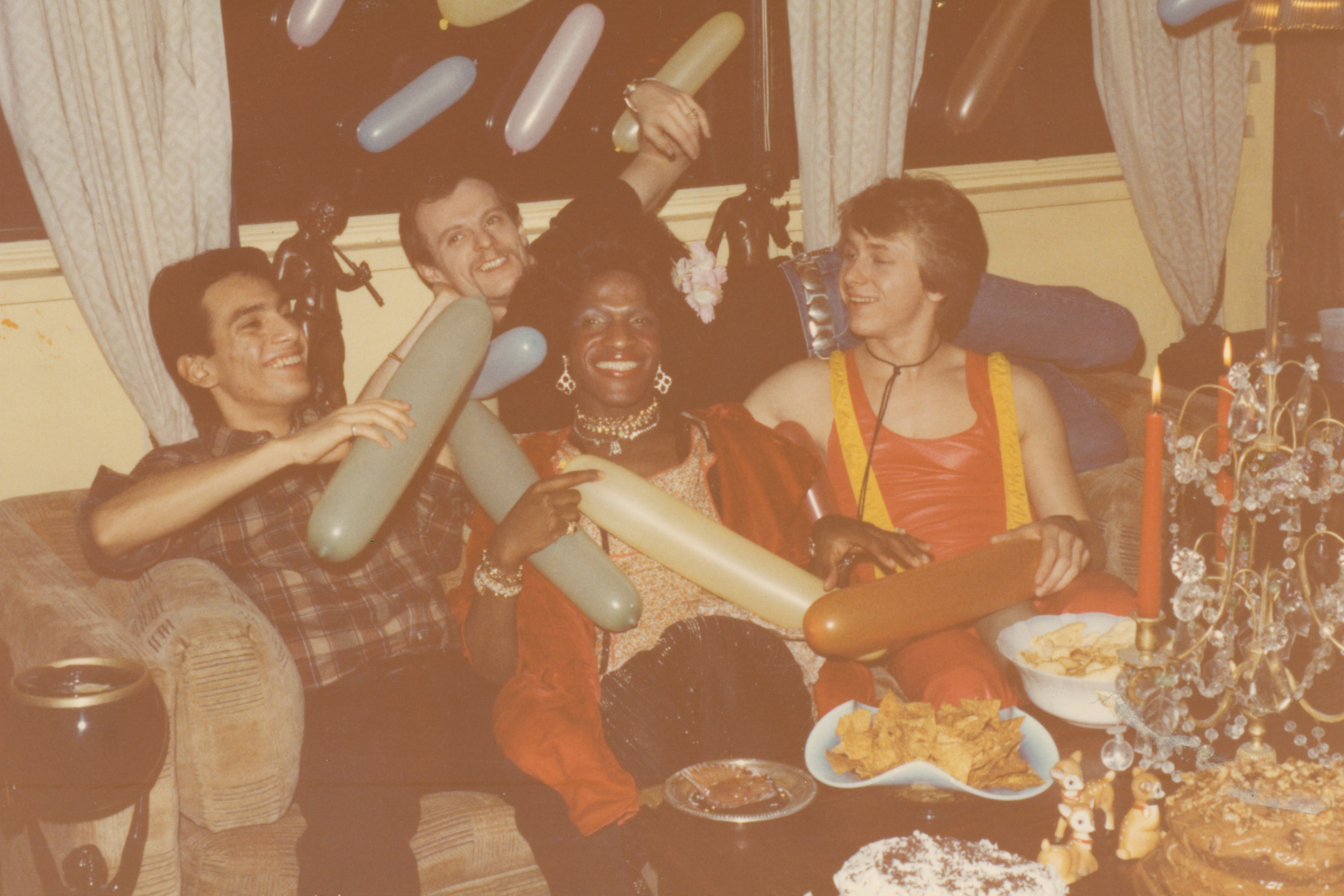 Photographs featuring Marsha P. Johnson sitting on a couch with friends, playing with balloons. These friends include Randy Wicker’s former partner David Combs, lying behind her wearing a black shirt and jeans. There’s also her roommate Willie Brashears is sitting to her right wearing a yellow and red leather outfit. In front of them is a table with party snacks.