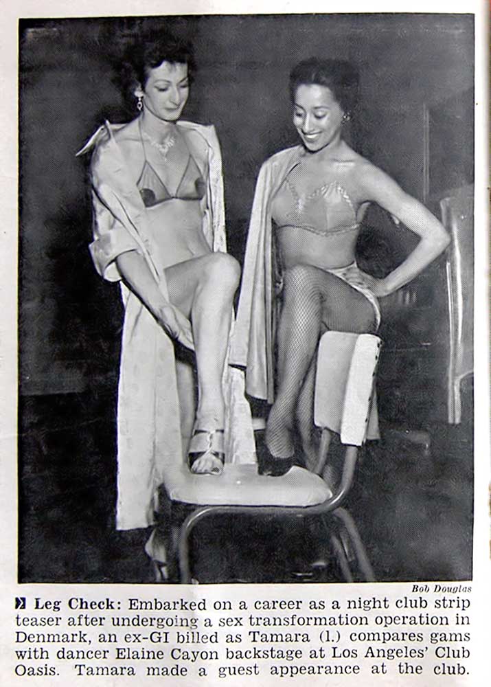 The following text appears at the bottom of the object: "Leg Check: Embarked on a career as a night club strip teaser after undergoing a sex transformation operation in Denmark, an ex-GI billed as Tamara (1.) compares gams with dancer Elaine Cayon backstage at Los Angeles' Club Oasis. Tamara made a guest appearance at the club."