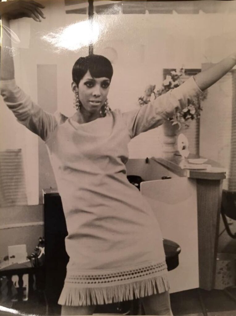 A photograph of Marlow Monique Dickson posing with her arms raised, wearing a fringed dress and large earrings.
