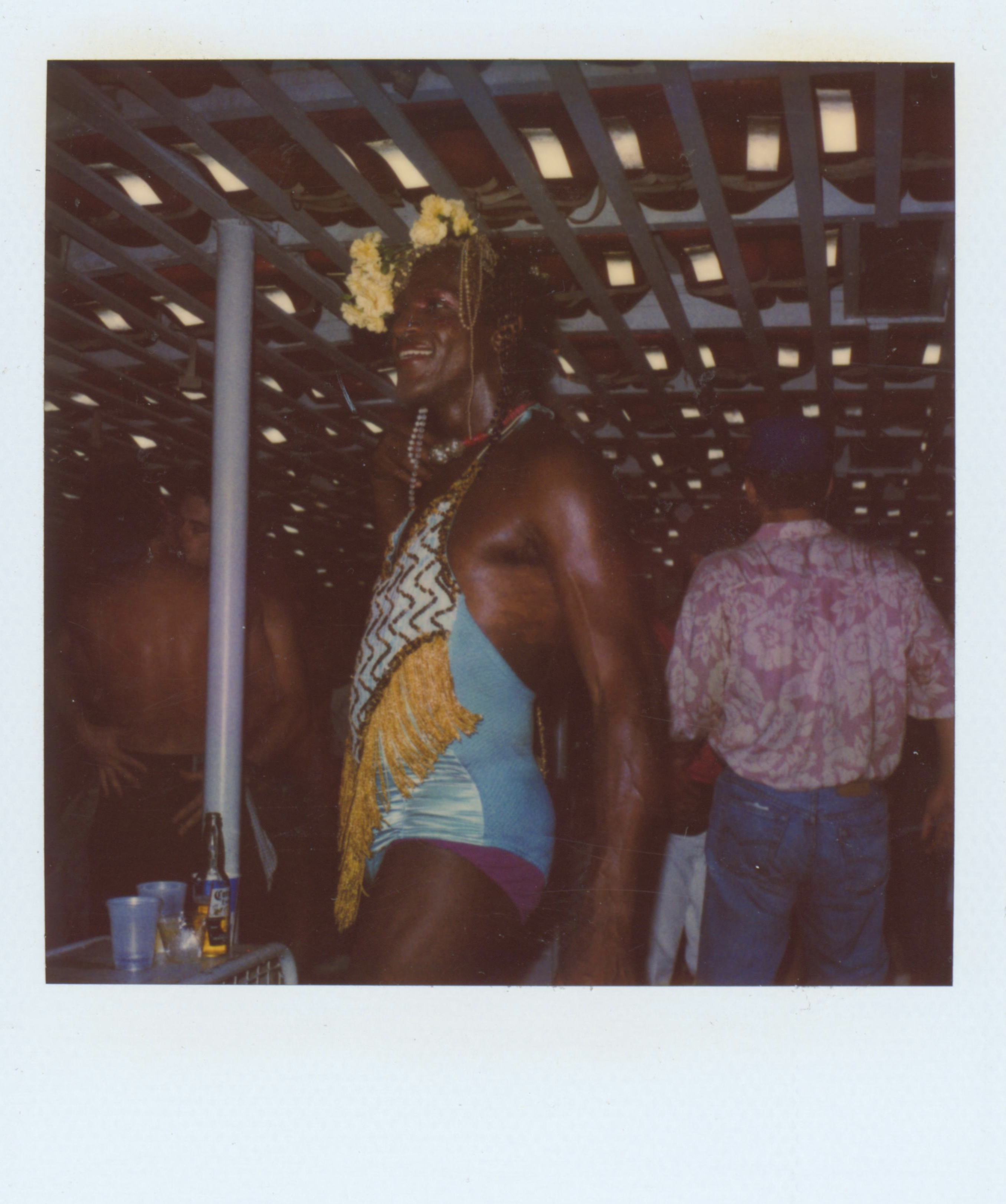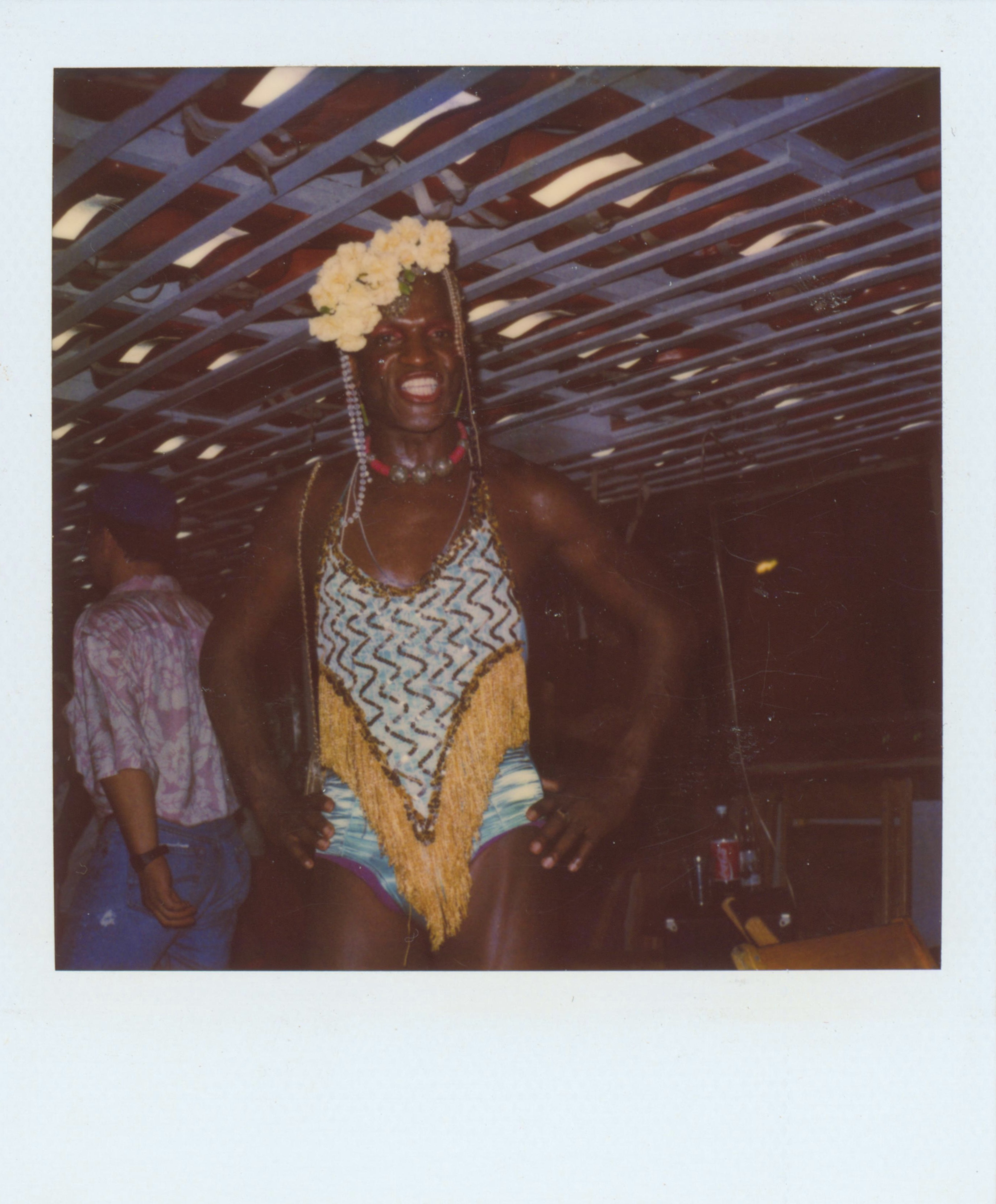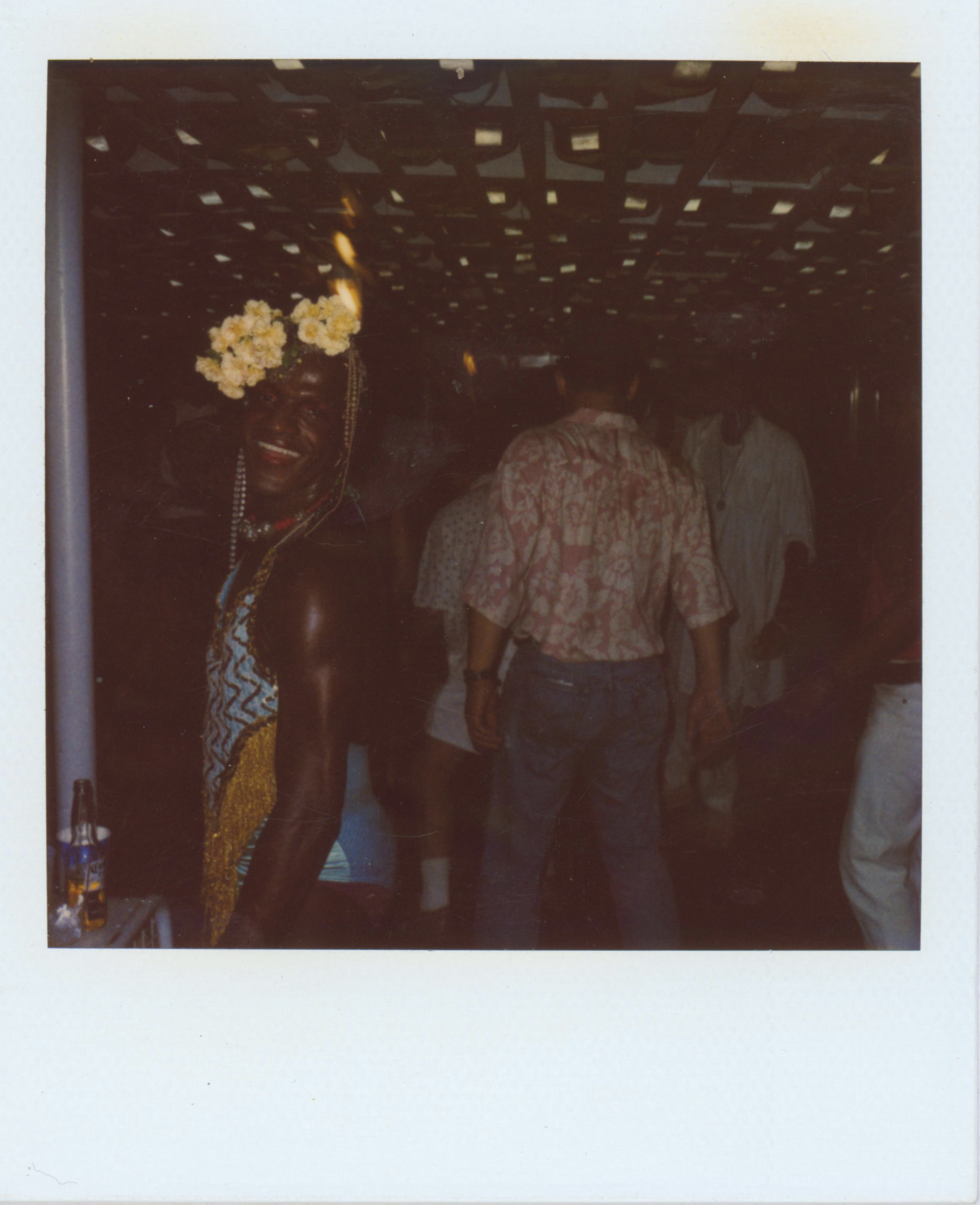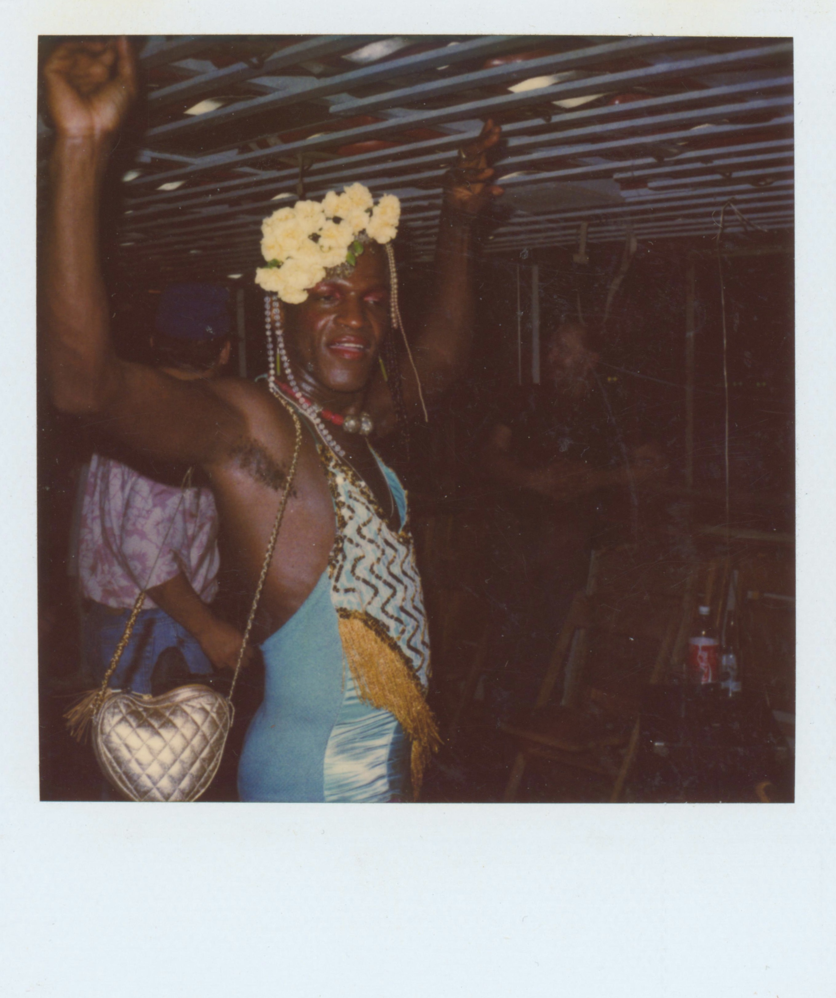 Polaroids of Marsha P. Johnson dancing and posing. She is wearing a sleeveless teal jumpsuit with yellow fringe, gold sequins, a yellow flower headpiece, and a heart-shaped purse.
