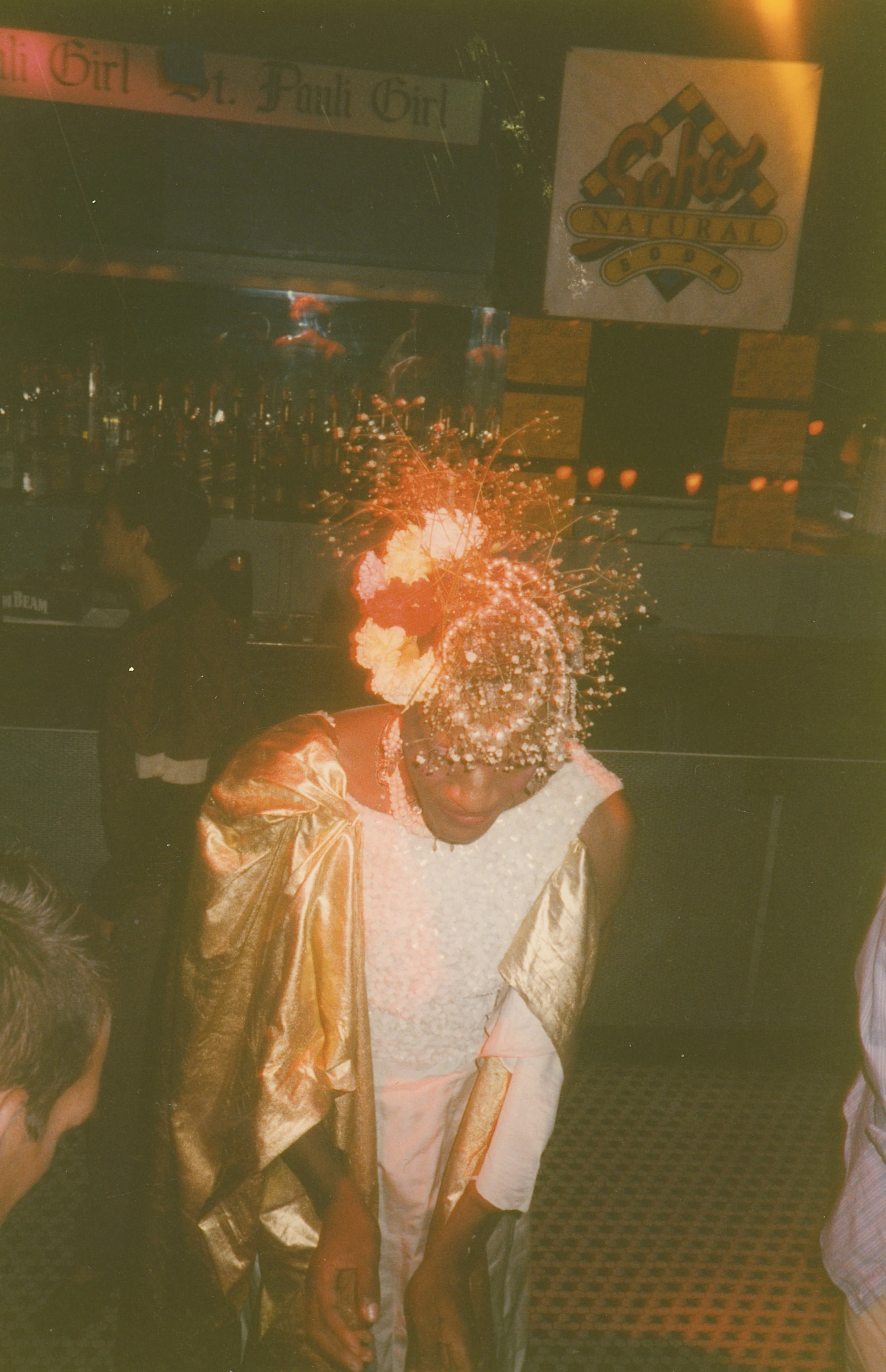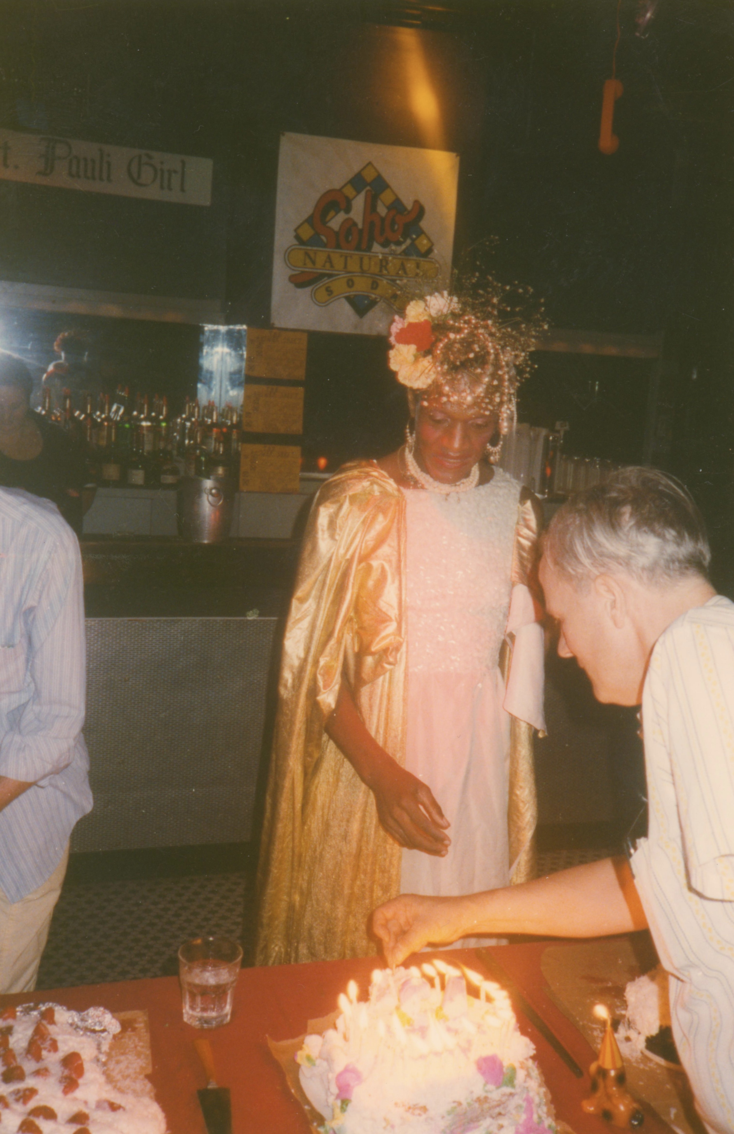 Photographs of Marsha P. Johnson standing in front of a birthday cake with lit candles. She’s at a bar for her birthday party. She’s wearing a floral and pearl headpiece, and white and gold sequined dress.