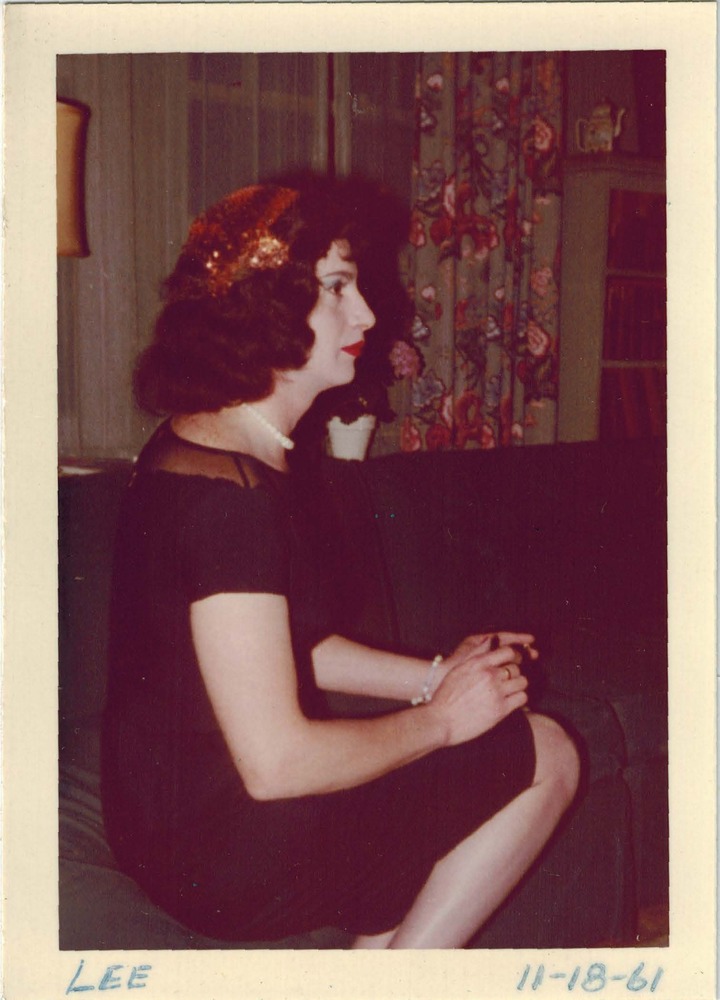 A photograph of Lee seated in profile at the second house party of the Playgirl Club.
