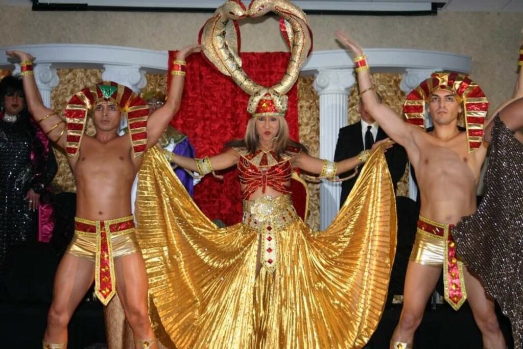 A photograph of Karina Samala and two others in Egyptian-inspired costumes. Samala poses in the middle holding her skirt out to either side and wearing a headdress with two large, gold snakes. Two people pose shirtless with their hands raised on either side of her in coordinating gold and red outfits.